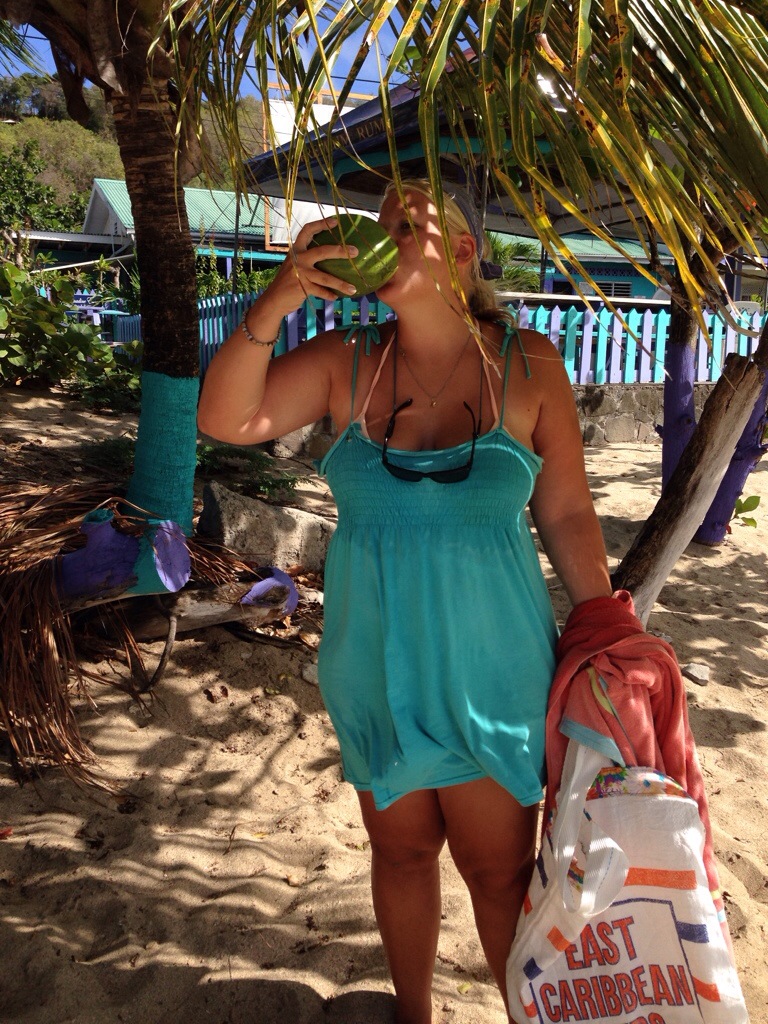 Sofie dricker ur en egenplockad och egenöppnad kokosnöt.