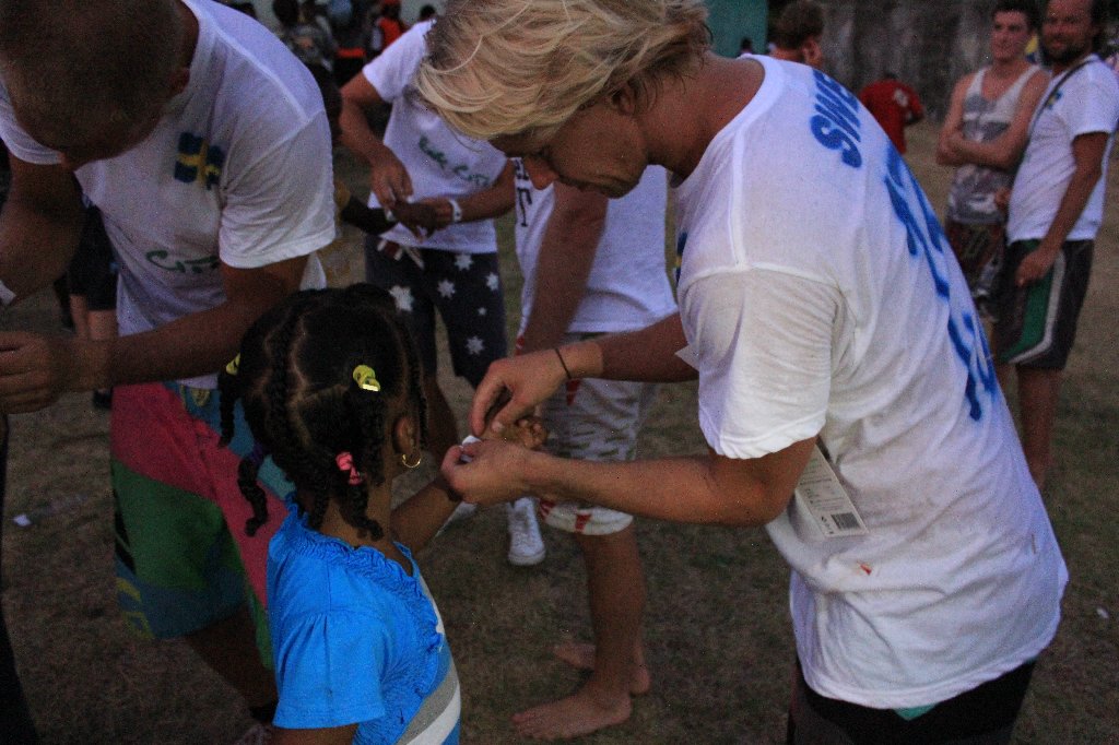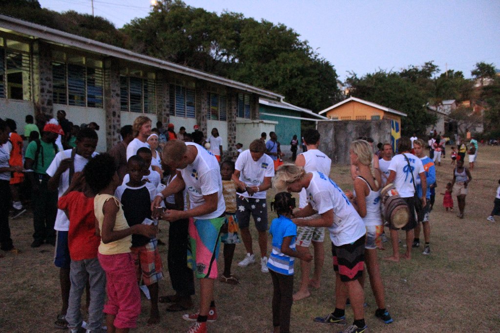 Första kvällen var det fest utan dess like, vilket innebar att dagen därpå tillbringades i ett lite lugnare tempo. Efter en match med det lokala fotbollslaget fick vi en förfrågan om att spela en tävlingsmatch med dom. Så dagen efter satt det lappar över hela byn om att ”Sweden vs. Union Island” skulle spela match och att ”You can´t miss this one!” Vi sprayade Sverigetröjor, gick till planen i procession med lokala killen Mango som gick först och trummade och tutade. Vi spelade en hård match, och hade en hejarklack som bestod av byns turister som hade gemensamt att de bodde närmre Sverige än Karibien 🙂 Det andra laget hade fotbollsskor och var betydligt mer tränade än vi, men helt bakom flötet var vi ändå inte. Det slutade 9-4 till ön, så vi fick tyvärr inte höra vår nationalsång spelas. Efteråt gav representanten för skolan ett tal och tackade oss för att vi deltog i matchen. Vi hade med oss klockor från Paperwatch som vi gav bort till barnen, och det blev en rusning utan dess like. Så nu går alla byns barn runt med vita klockor på armarna.