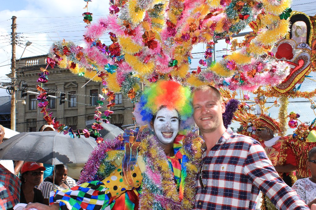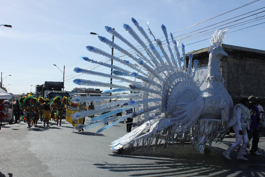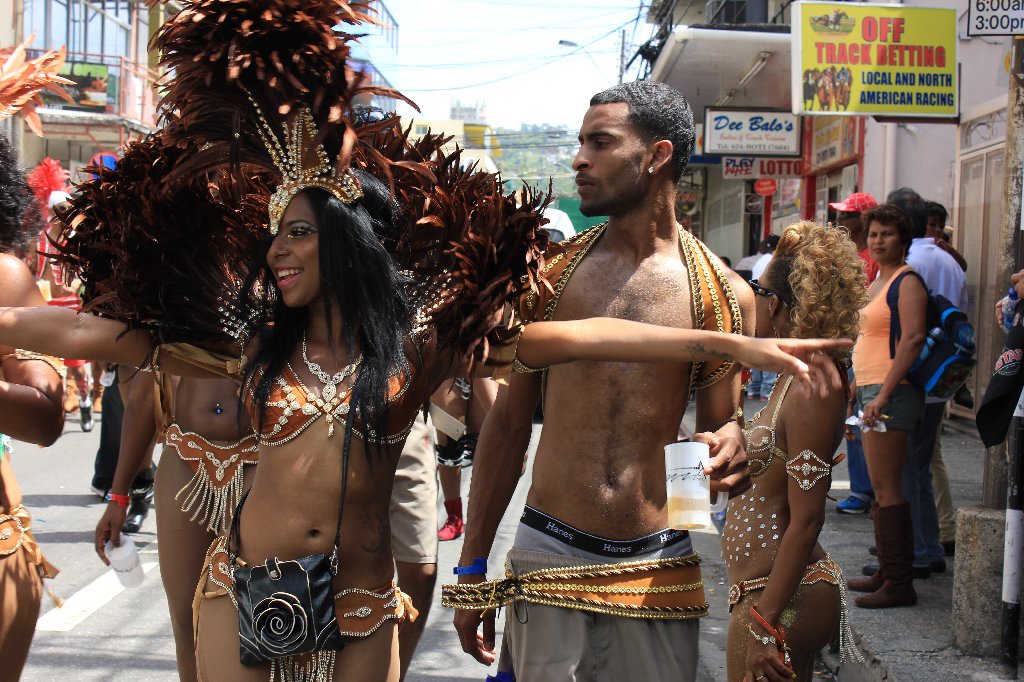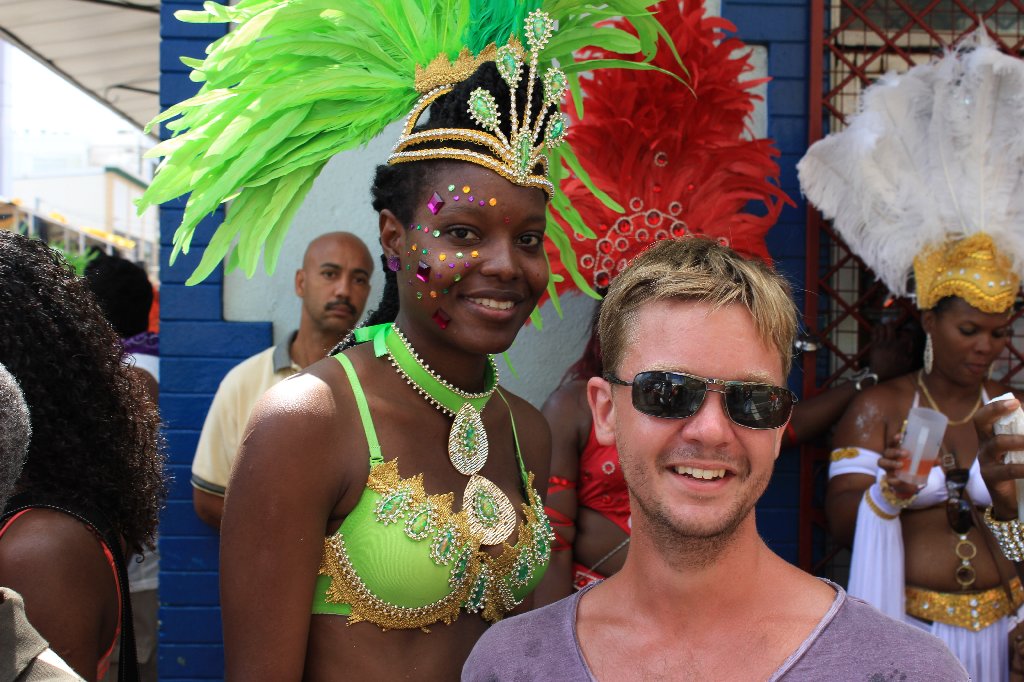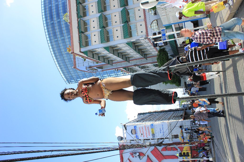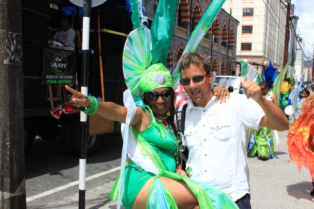 Den stora karnivalsparaden/finalen var i tisdags. Några av oss hade beställt transport av den lokala fixarkillen Jessie James, och för att undkomma trafiken så var vi inne i Port of Spain väldigt tidigt, kl 07. Vi käkade på Subway Express, dvs en vanlig Subway med galler runt om. De gjorde mackan på ett bord utomhus och sen fick man mackan genom gallret. Det var många restauranger som hade gjort så längs gatan som paraden var. De har väl lärt sig att det inte är så bra att släppa in alla tusentals människor som går längs gatan den dagen.