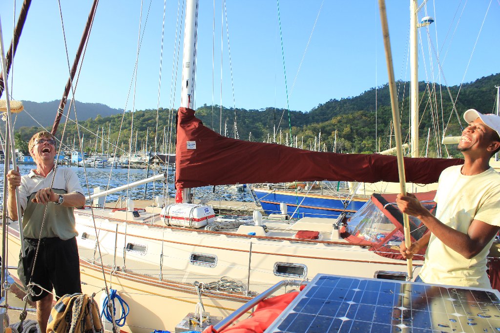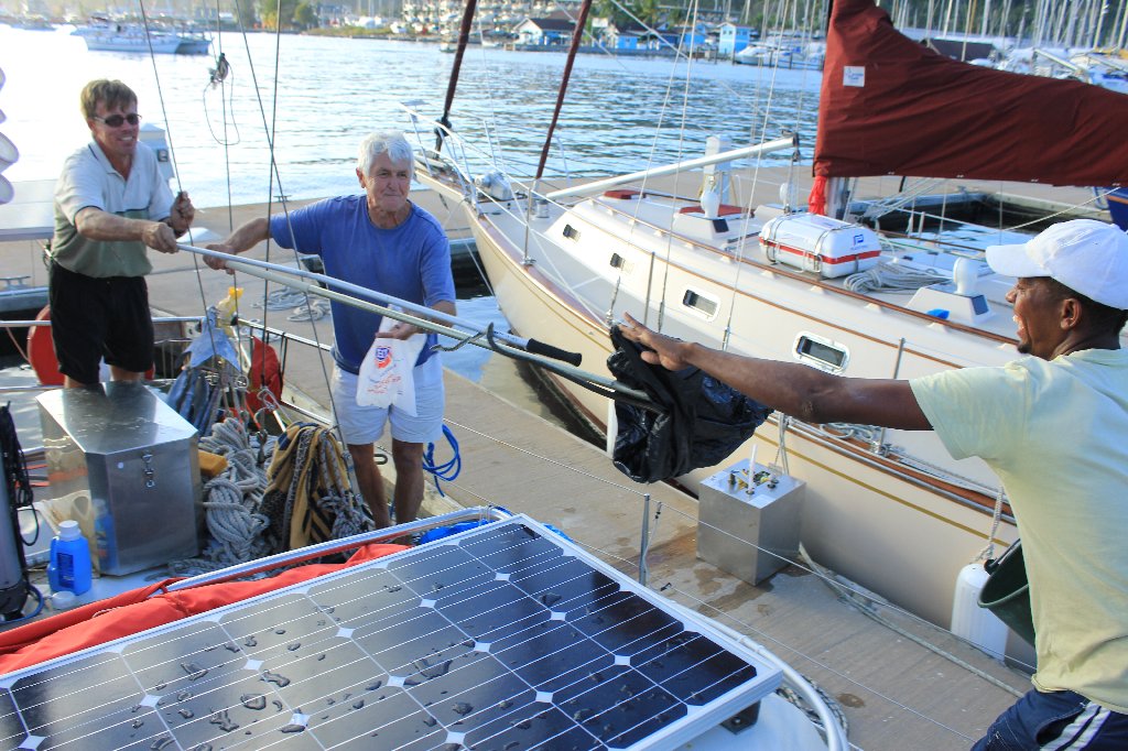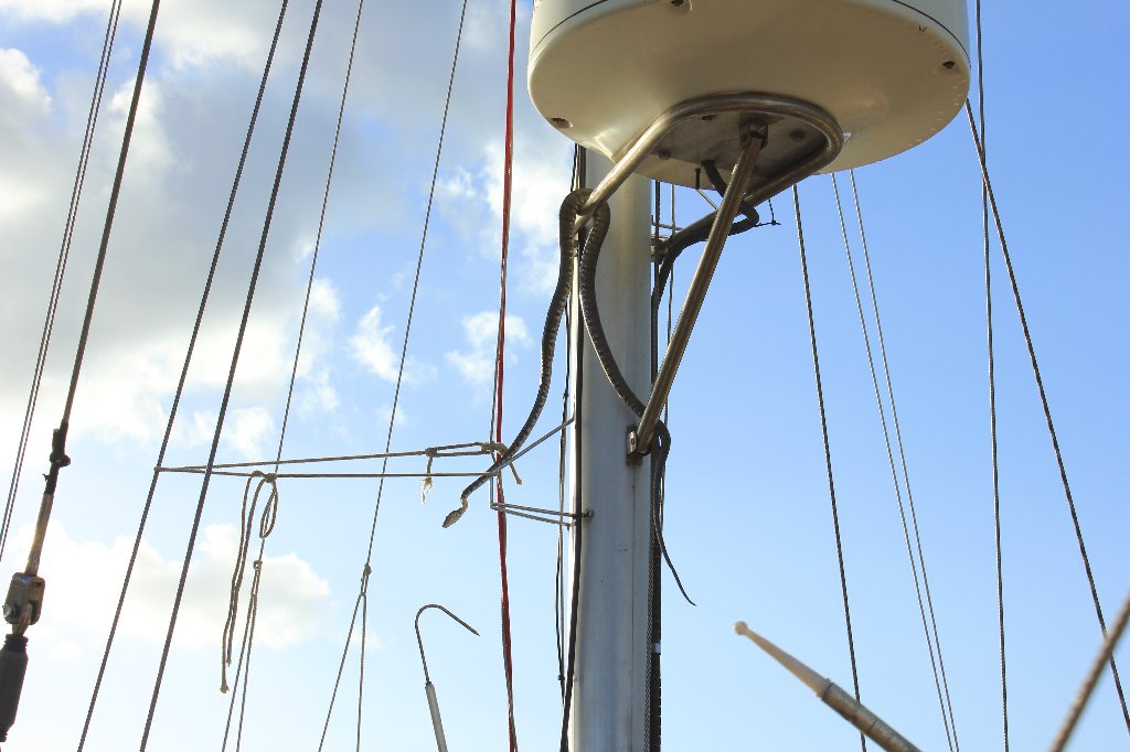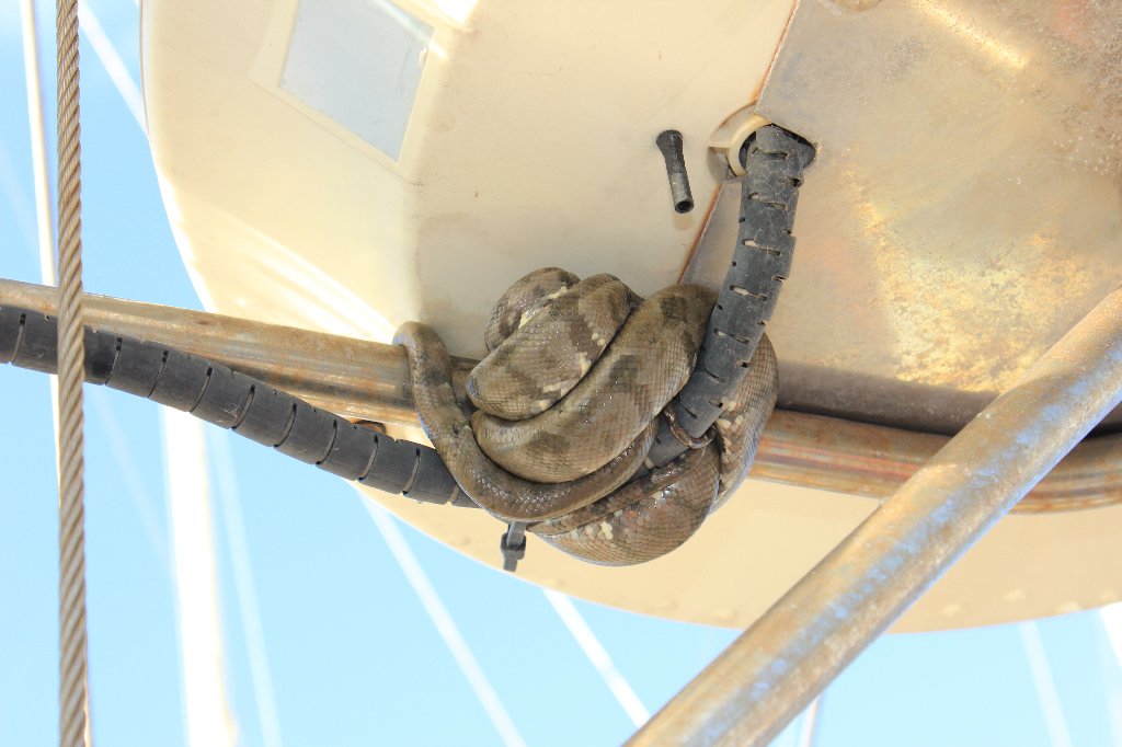 På eftermiddagen kom Jonas, en svensk riggexpert, och kontrollerade vår rigg. Han sa att den var i bra skick förutom en vajer som behövde bytas ut (det visste vi redan). Vad han däremot hittade var en ca 1,5 meter lång orm som lång ihopringlad under radarn. Som tur var så erbjöd de sig att ta bort den åt oss, så Jonas, hans medhjälpare, och en man från en grannbåt stod med båtshakar och krokar och drog i ormen. Sen stoppade de ner den i en påse och gick bort med den till skogen där de släppte den. Vi har ingen aning om när den kom ombord, och vi vet inte om den är giftig. Kanske någon som läser bloggen vet? Enligt folk på marinan så har de bara en giftig orm på Trinidad, men den lever inte i det här området. Vi kan ju i för sig ha fått den ombord när vi varit på någon annan ö. Det läskiga är också att den satt ovanför mitt och Jakobs fönster som vi har öppet hela tiden. Kul om man hade fått en orm på magen på natten… Usch!