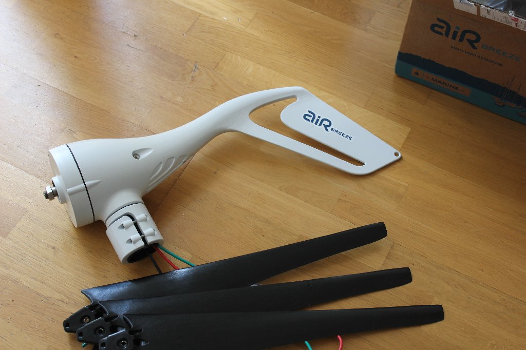 Tack vare ett finskt företag, www.reps.fi, sved det inte lika mycket i vår budget som det kunde ha gjort. Nu har vi iallafall en Air Breeze Marine, av de bästa vindgeneratorerna för fritidsbåtar som finns på marknaden, och det känns skönt. Förhoppningsvis brakar den inte ihop de första dagarna… Nu återstår ”bara” montering, och även om vi vet att vi ska ha den i mesanmasten så är vi inte helt på det klara med exakt hur vi ska få den att sitta kvar där.